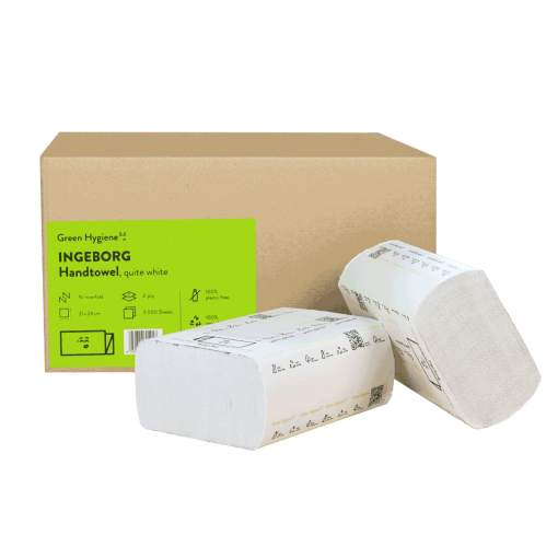 Die Papierhandtücher "Ingeborg" von Green Hygiene bestechen durch ihre ausgezeichnete Nachhaltigkeit. Die Produktion erfolgt zu 100% CO2-Neutral und unter alleiniger Verwendung von recyceltem Altpapier. Gleichermassen ökologisch ist die Verpackung, bei der vollständig auf Plastik verzichtet wird. Ingeborg ist somit zu 100% Plastikfrei. Das ideale Papierhandtuch für den umweltbewussten Hygienebereich von Raststätten, öffentlichen Einrichtungen und Grossveranstaltungen.