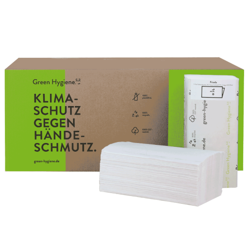 Die Papierhandtücher "Frieda" von Green Hygiene bestechen durch ihre ausgezeichnete Nachhaltigkeit. Die Produktion erfolgt zu 100% CO2-Neutral und unter alleiniger Verwendung von recyceltem Altpapier. Gleichermassen ökologisch ist die Verpackung, bei der vollständig auf Plastik verzichtet wird. Ingeborg ist somit zu 100% Plastikfrei. Das ideale Papierhandtuch für den umweltbewussten Hygienebereich von Raststätten, öffentlichen Einrichtungen und Grossveranstaltungen.