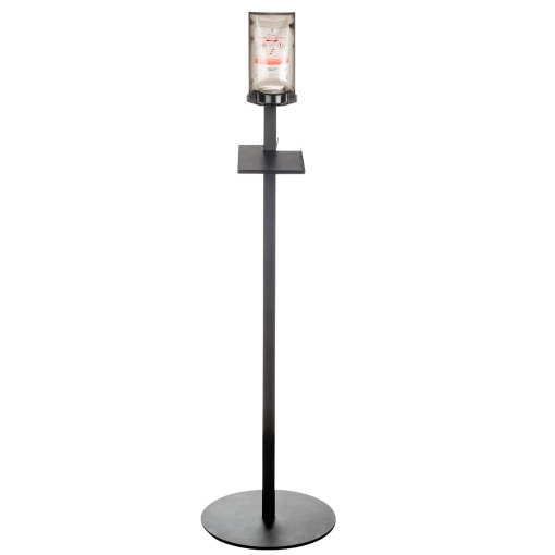 Bodenständer aus schwarzem Metall mit Tropfschutz. Der Ständer ist stabil und hat ein stilvolles Design, das zu Sterisol-Spendern der Größe 0,7 l passt.