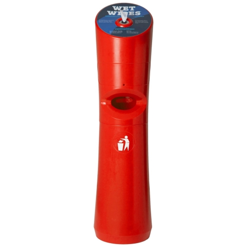 Dieser Kunststoffstandspender besteht aus einer Spendereinheit und einem Mülleimer, der in dem Tower integriert ist.